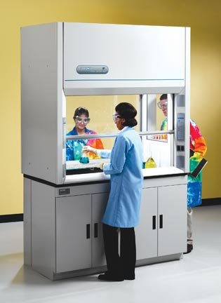 Hood; Fume; Laboratory; Labconco; Protector; Pass-through; Width: 6 ft; Window: Rt side; Weight: 610 lb.; Two 3/16 in thick tempered safety glass vertical-rising sashes; By-pass airflow w/ Clean-Sweep; Audible alarm; Epoxy-coated steel.