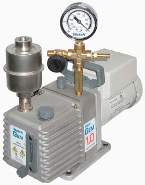 Pump, vacuum; Welch Gem Model 8890A-70; Welch no. 8890A55; For rotary evaporations w/high boiling point solvents; Free air displacement 31L/min.; Ultimate vacuum 0.1 torr; Oil cap. 0.5 qt.; Accepts tubing 10mm I.D.; 14.5Lx5.12Wx14.4 in.H; 27.5 lb.; 115V 6.